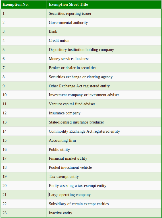 Yes, 23 types of entities are exempt from the beneficial ownership information reporting requirements. These entities include publicly traded companies meeting specified requirements, many nonprofits, and certain large operating companies.